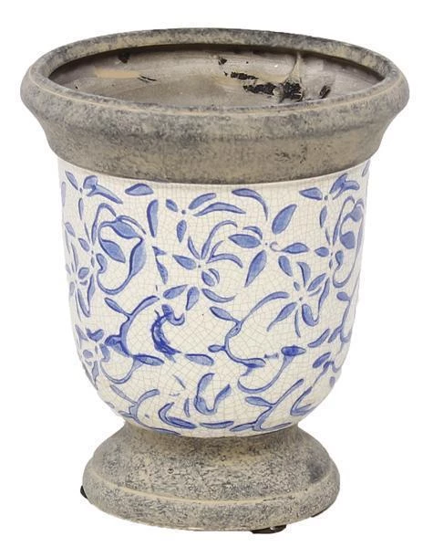 A beautiful floral arrangement is elevated by its beautiful container. Here’s a lovely choice: this gloss-matte combo blue and white compote vase with a crackle finish.