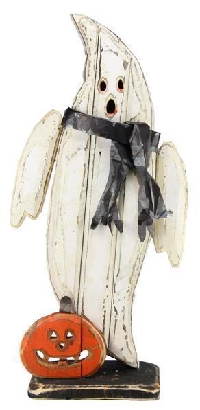 Can’t you think of several ways to use this fun elongated orange wood and tin pumpkin in your fall displays? We can!