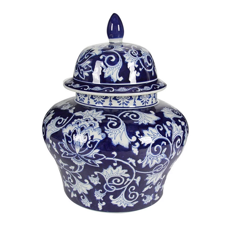 The bold contrast of blue and white combined with elegant flourishes infuse the large Aline Ginger Jar with a timeless grandeur. Whether used on a grand mantle in a traditionally-styled room or placed in a bright, airy garden-themed space, this jar brings