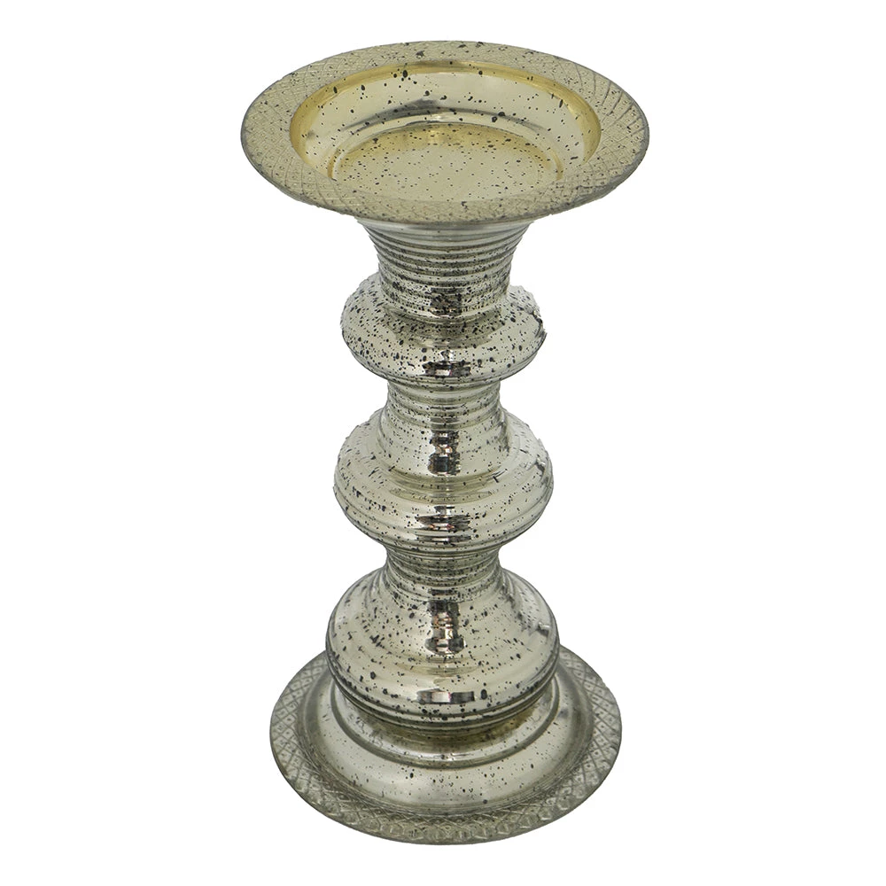 Crafted of antiqued silver glass, this pillar candle holder has a traditional look. The decorative holder has ribbed glass detail that enhances the round base. The shiny metallic holder will add visual appeal along with functionality to your home. Three sizes.