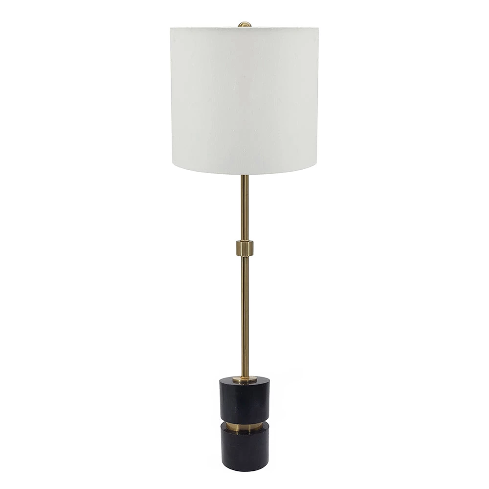 This large metal banded buffet lamp is made with a black marble base and cylinder shade that enhance the straight forward elegance of its tall, lean form. Ideal for complementing sideboards and other structural furniture staples, this large lamp stays minimal while not shying away from introducing a statement of quality to a room. It’s finished in brass tones to make it extra versatile.