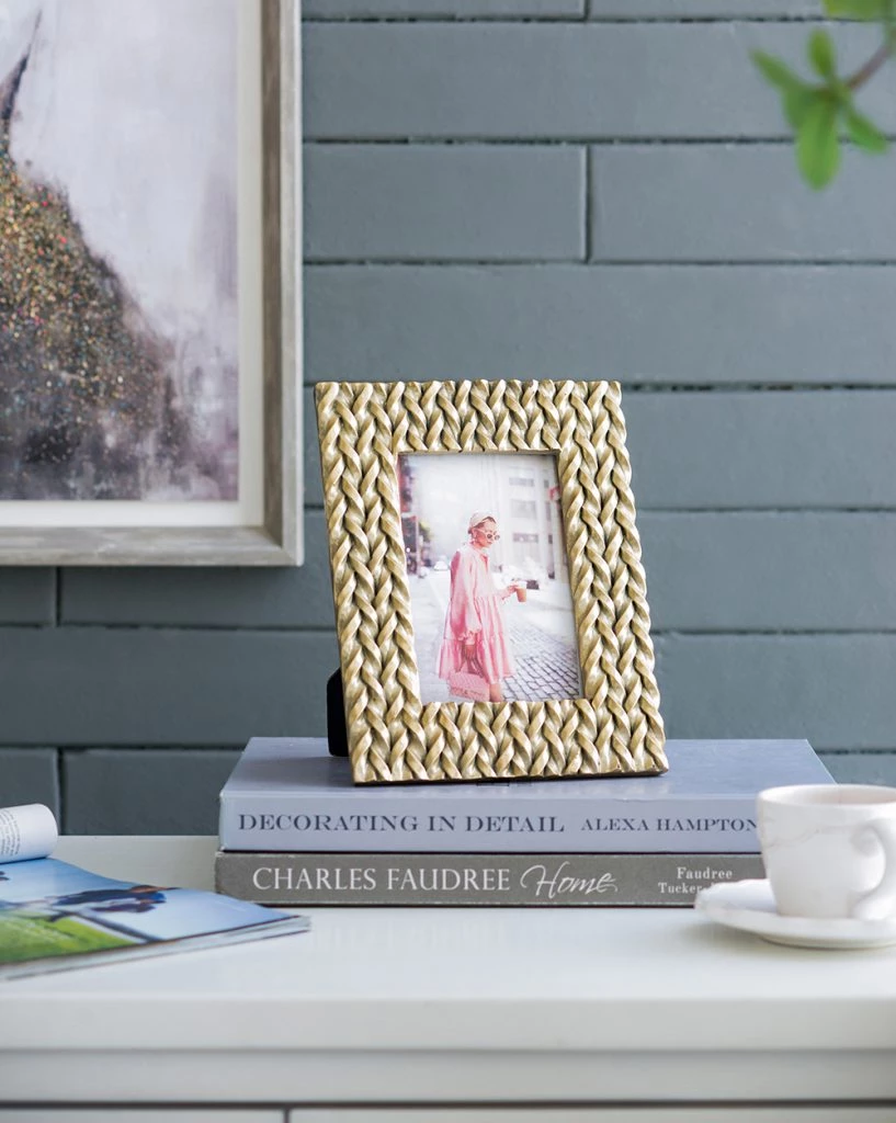 With its elegant twisted design and rich gold finish, this 4″ x 6″ frame adds dynamic texture and a crisp shine that brightens any room. Liven up your office, master bedroom, or living room with this brilliant frame. The lavish gold finish complements virtually any color scheme to perfectly showcase the beloved faces of family and friends.