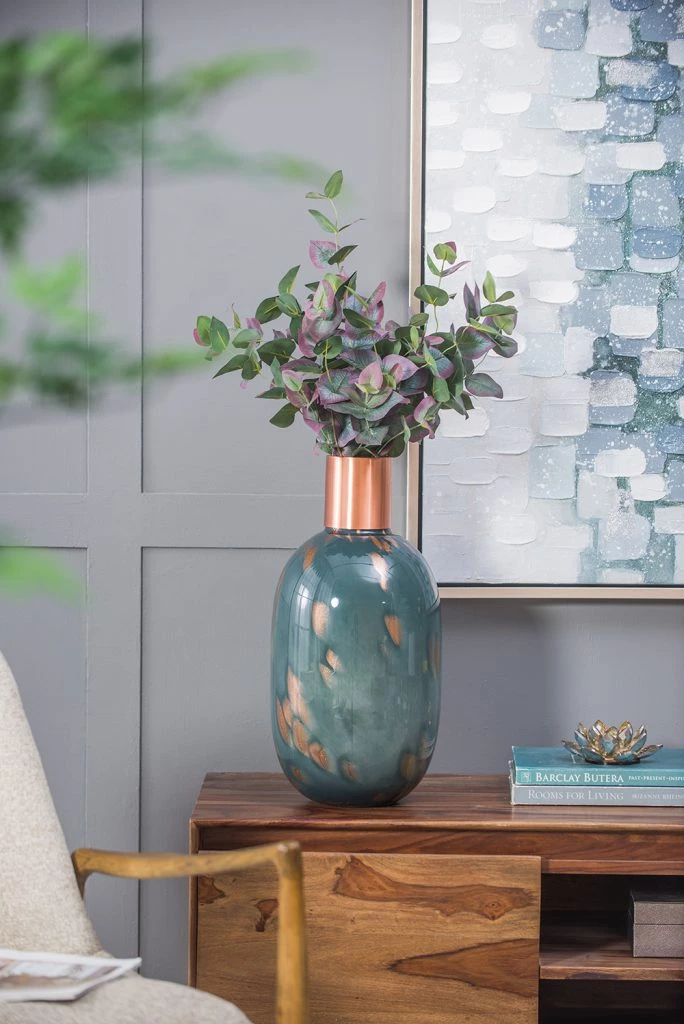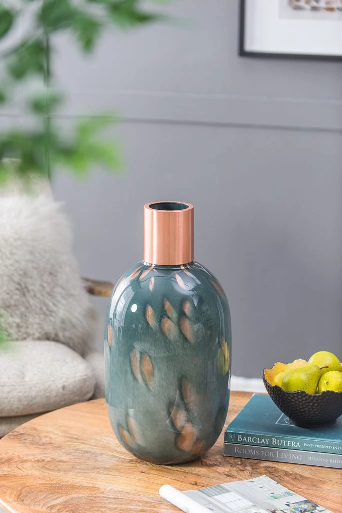 The Kata Glass Vase unveils eye catching details to your design. The copper color trimming of the vases neck is simple allowing the soft swirled design of the glass to accentuate the handcrafted caves seen throughout the vase. Compatible in any transitional design, the blue and copped color scheme of the vase fits perfectly to accentuate and side table.