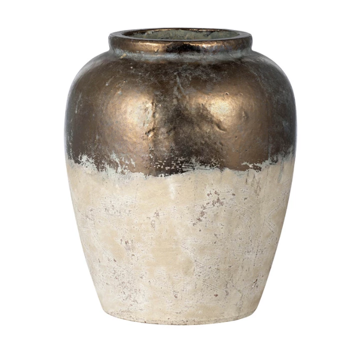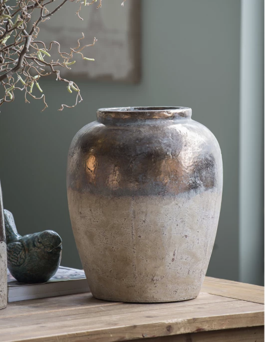 Use the lovely Candia Ceramic Vase to bring warm neutral color and an on-trend metallic sheen to your favorite space. The colors and distressed finish come together to create a style that transcends eras. The larger size makes it easy to find a suitable home for this vase on a table, shelf, or as part of a decorative arrangement.