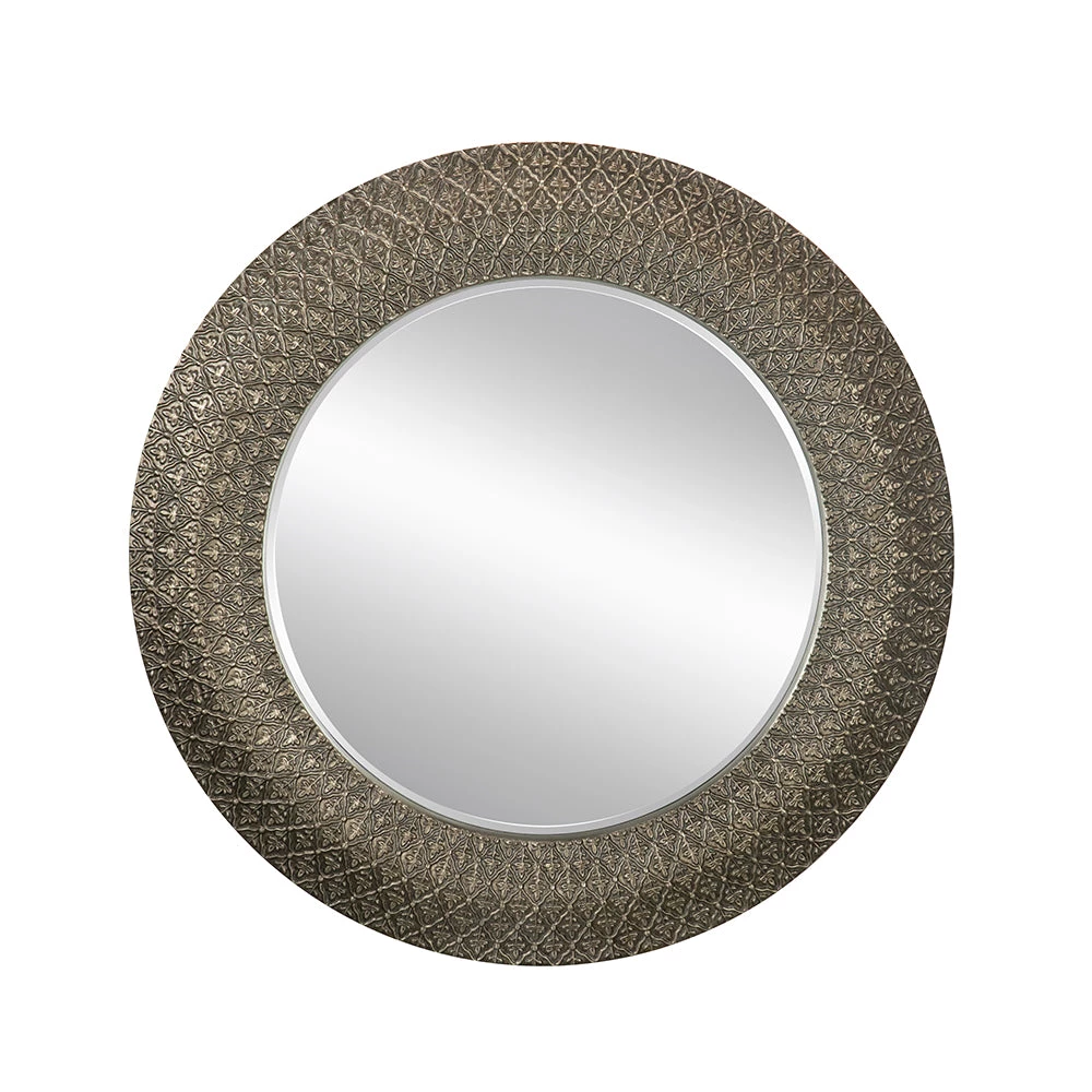 The Howe wall mirror has a three dimensionally sculpted wide frame that is finished in a muted silver tone. Boasting a large 39-inch diameter, this wall mirror will make a striking feature on the walls of any interior. A creative way to enhance space and light.