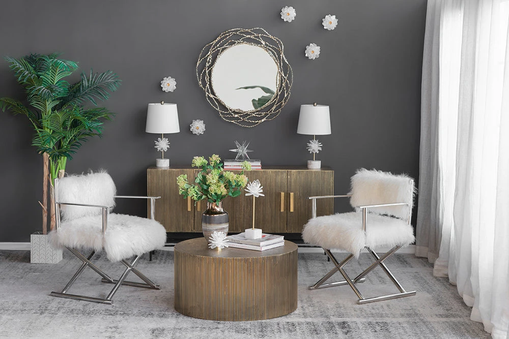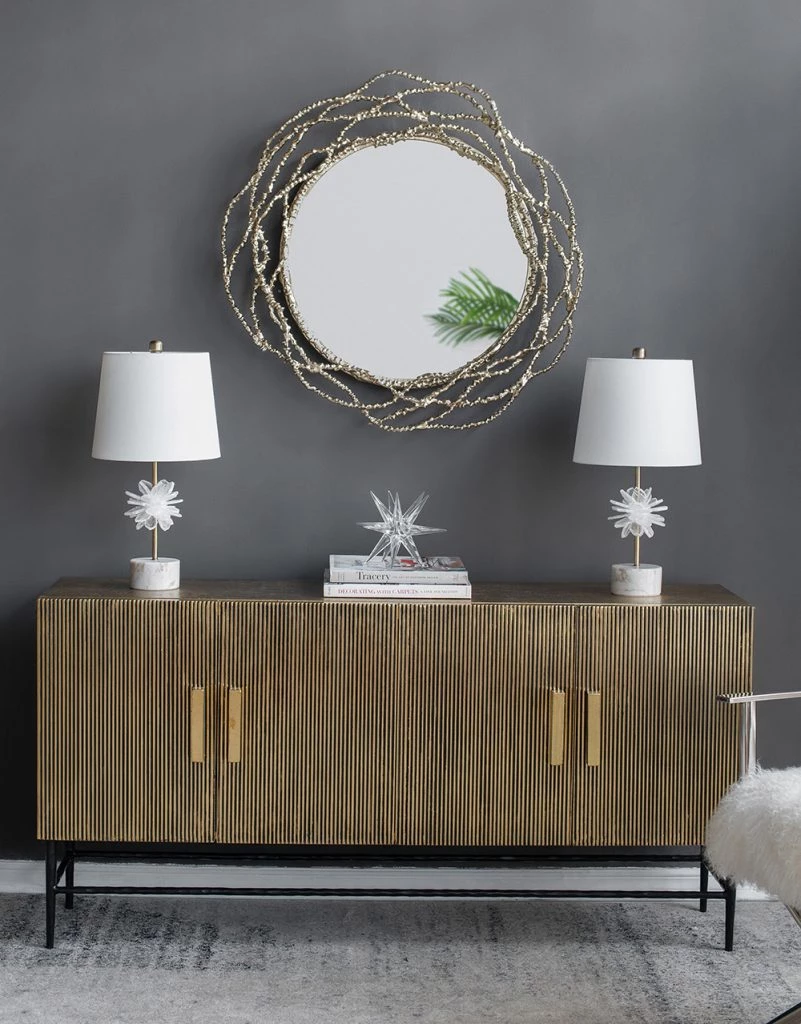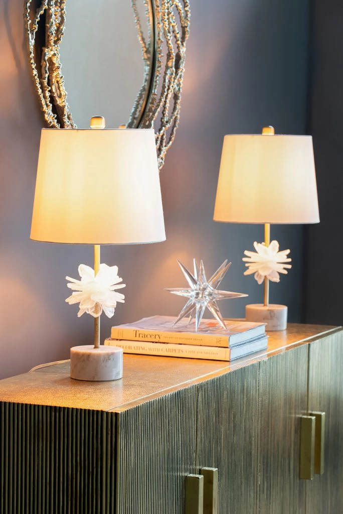This round selenite and marble base table lamp is the ideal option for brightening a space and adding glamour to its décor. White selenite stone and marble are precisely hewn into geometric stem structures. Their pale tone complements the white fabric shades and are accented warmly by the golden metal base.