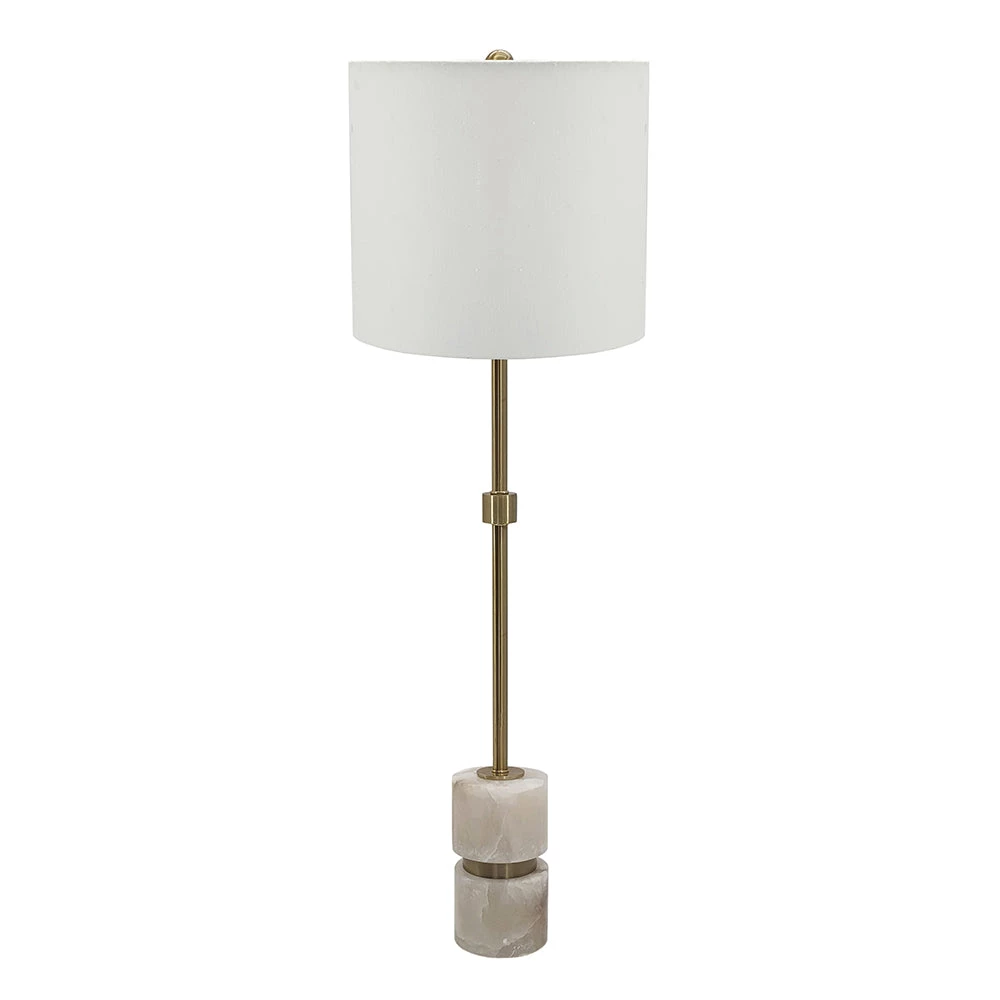 This large metal banded buffet lamp is made with an alabaster base and cylinder shade that enhance the straight forward elegance of its tall, lean form. Ideal for complementing sideboards and other structural furniture staples, this large lamp stays minimal while not shying away from introducing a statement of quality to a room. It’s finished in white and brass tones to make it extra versatile.