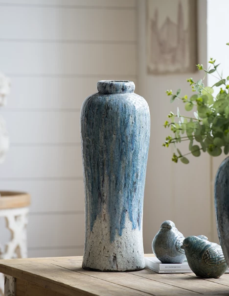 Bring a dash of fascinating color to your interior with this handsome terracotta vase. This lovely piece features a crackled blue and white finish to give the illusion of age, like a treasured heirloom. The narrow mouth offers support for small groupings of fresh-picked or dried floral arrangements.