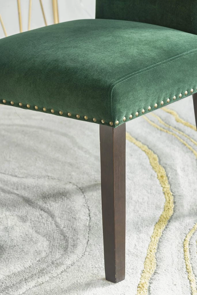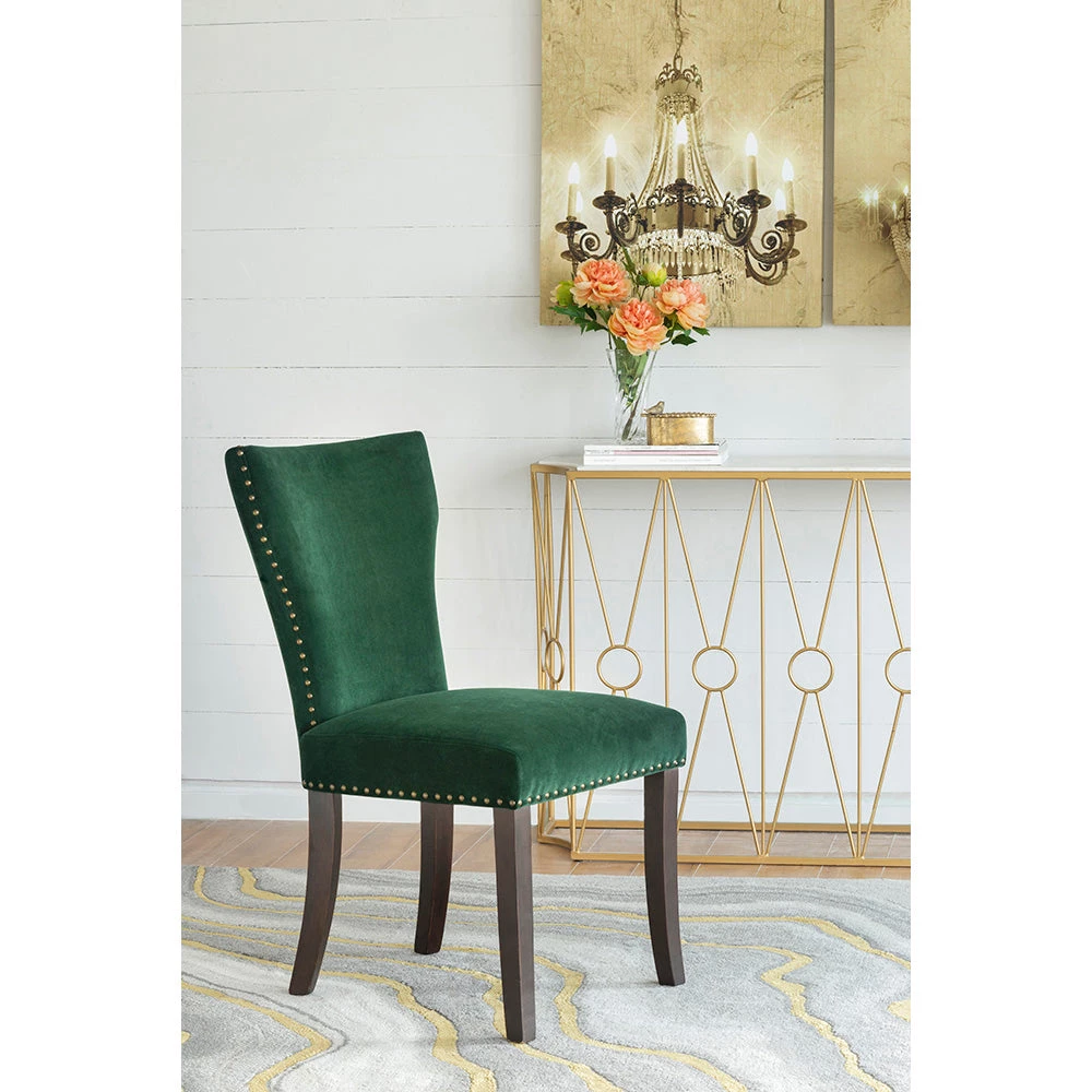 This sophisticated velvet, armless dining chair delivers an equal dose of classic style and modern comfort. The stylish gold nail head trim on the dark green velvet backrest creates an appealing visual contrast. Curving dark wood legs provide excellent stability as well as a feminine touch making the elegant velvet chairs stand out even more.