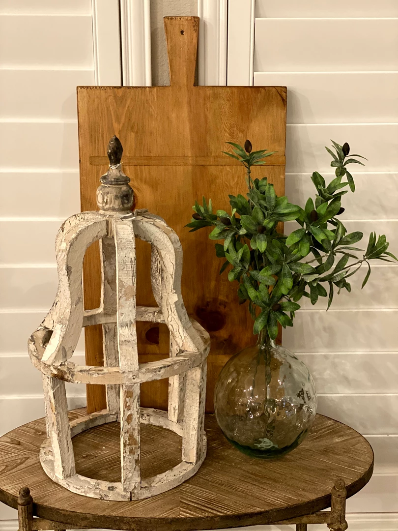 Lovely and versatile for any season, our gorgeous white distressed wood open lantern will star in your centerpiece, hearth grouping, or table vignette. The round lantern features a crown top and finishing finial. Fill with florals or greenery, jar candle, seasonal items–just imagine! Â