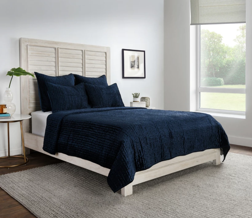 Hand stitched ocean blue velvet king quilt, with three euro shams.