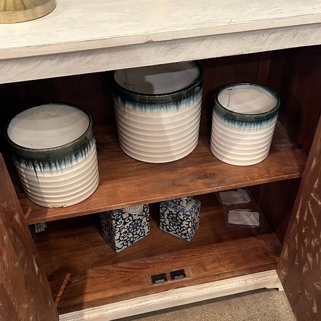 Harmony Sideboard has four cabinet doors, each with a floral pattern hand carved into its front. A fixed shelf inside the cabinet provides ample storage for serving ware and other dining essentials.
