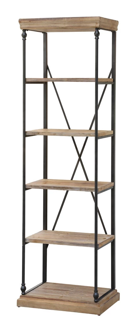 This metal and wood etagere has that industrial/farmhouse style featuring black metal supports and whitewashed natural wood finish. How could you use this piece in your office, living room, dining room, or game room?Â