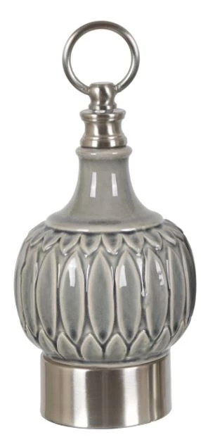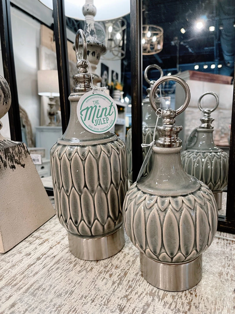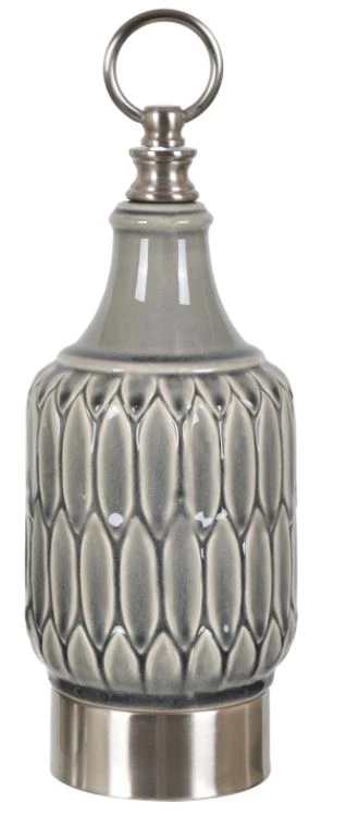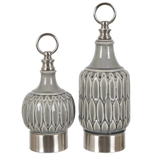 Smart good looks define these geometric patterned grey ceramic jars with stainless base and ringed stoppers. Available in two sizes.
