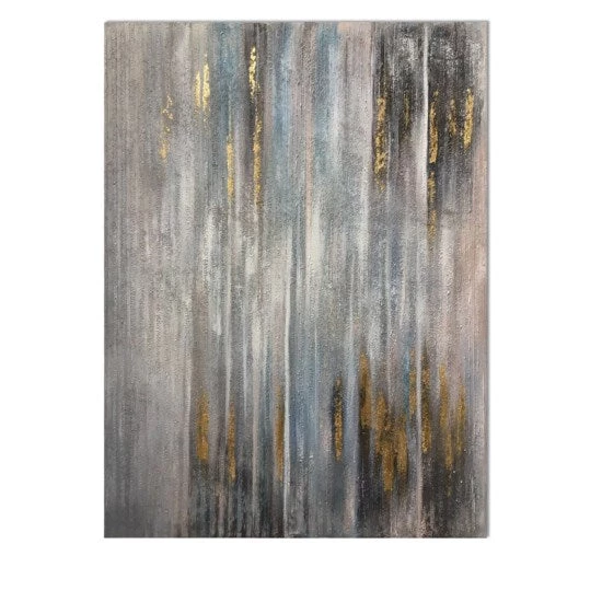 Large abstract painting on canvas features pale blues, blush, and black with gold highlights. Dynamic!
