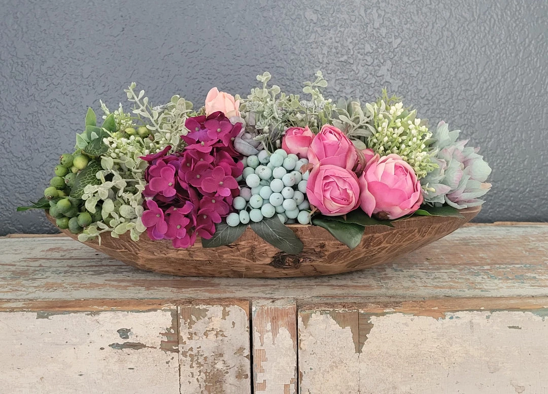 Just right for console, coffee or dining table, this colorful design features real touch pink and fuchsia rose buds with burgundy hydrangea blooms, mint berries and soft green succulents and greenery. We love the dough bowl container!