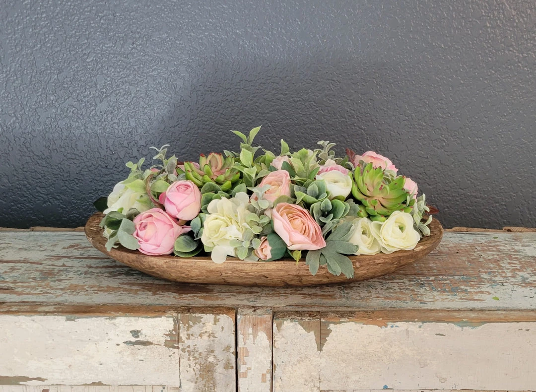 This wood doughbowl is designed with real touch pink roses and cream ranunculus.Â