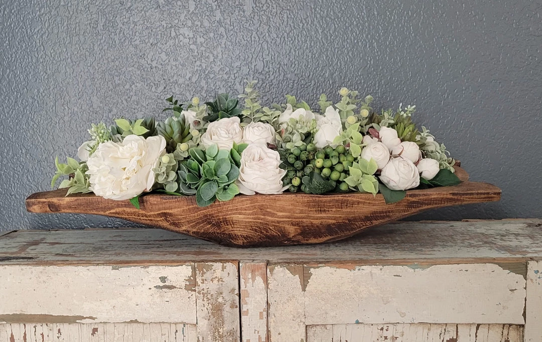A delightful and fresh looking centerpiece, our dough bowl design features real touch white peonies and roses nestled among greenery, berries and succulents.Â