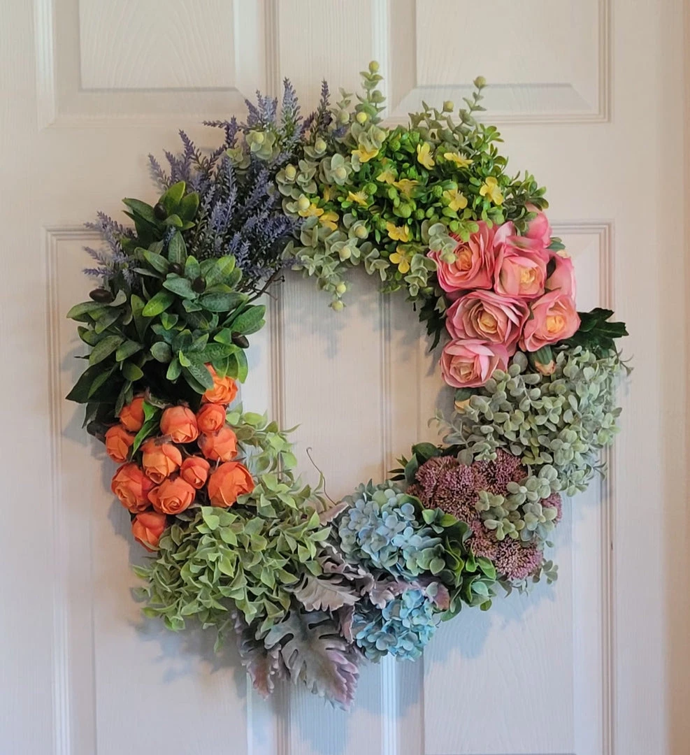 Color blocking with florals–a fresh take on wreath crafting! You’ll love this spring/summer wreath featuring sections of multi-hued florals interspersed with greenery. Ranunculus, roses, lavender, hydrangea, assorted eucalyptus–you really can have it all!Â