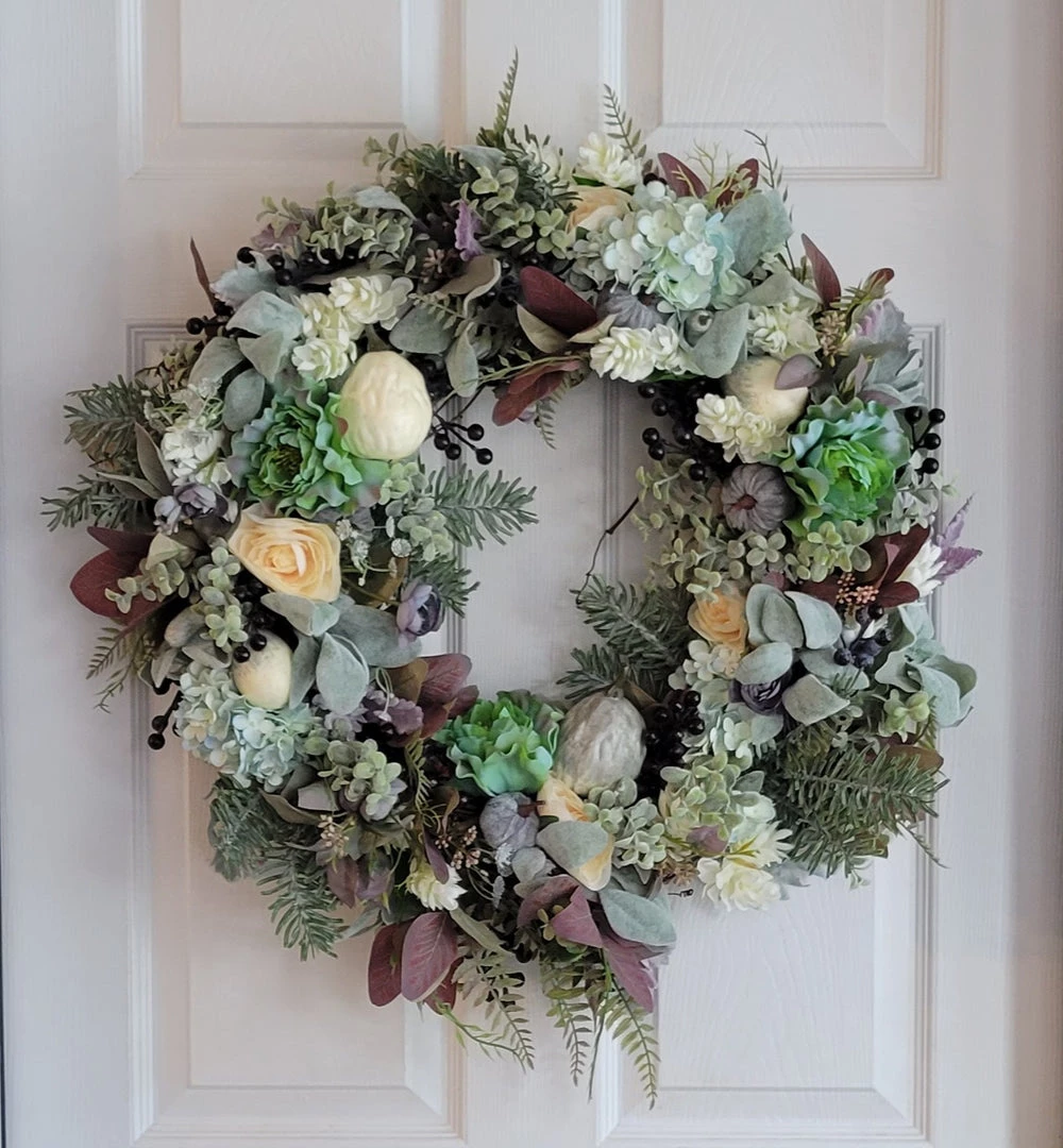 This wreath is designed with assorted eucalyptus, hydrangea and assorted gourds.