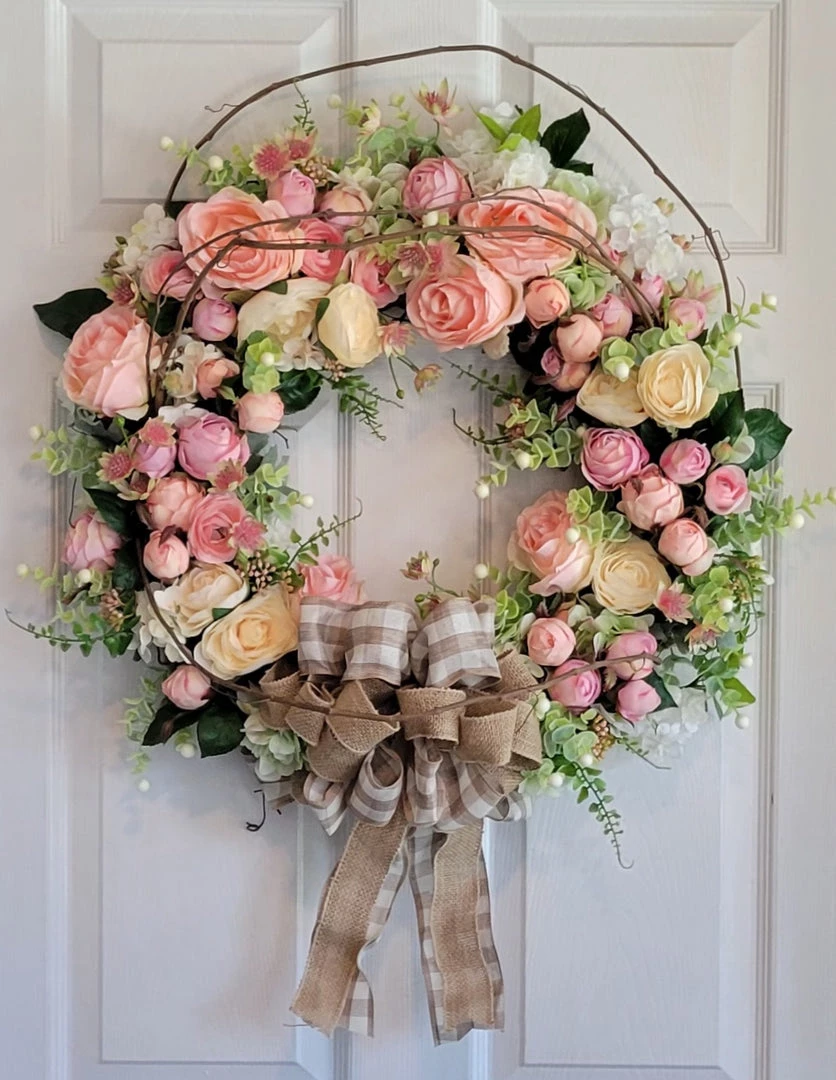 Ooh la la! Bursting with pink, cream and white roses and accented with white berries, willow and greenery, this French Country wreath with its tan buffalo check and burlap bow is sure to delight!