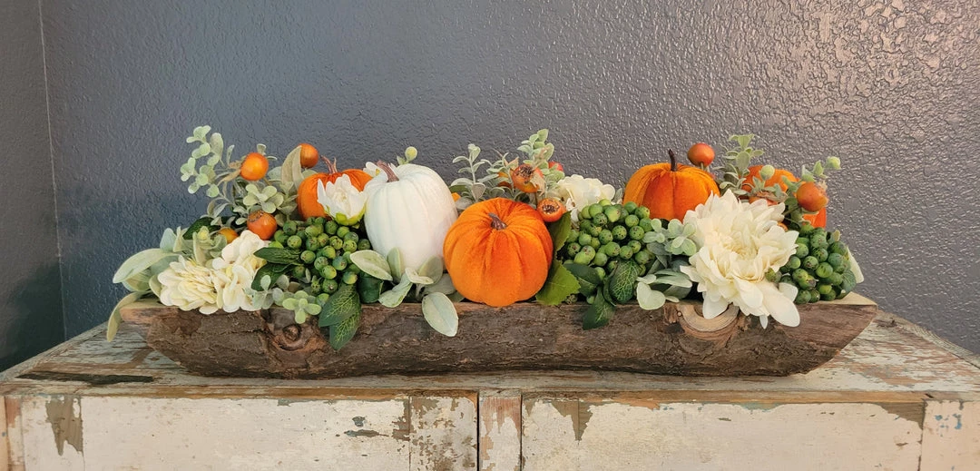 This wood trough is designed with velvet pumpkins, real touch cream dahlia and green berries.Â