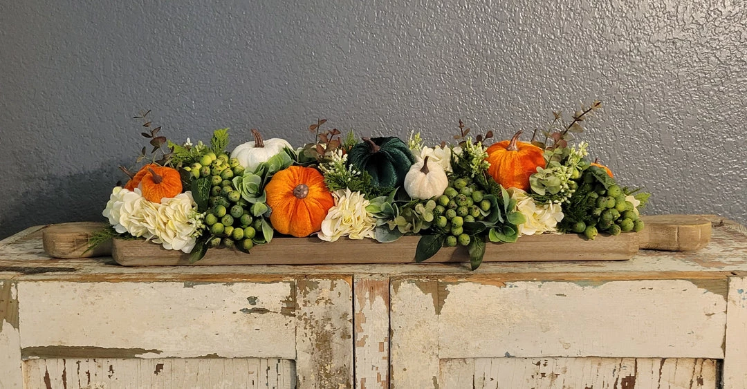 This wood breadboard is designed with velvet pumpkins and cream hydrangeaÂ