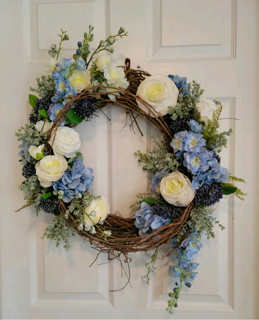 This wreath is designed with cream ranunculus and various shades of blue.Â