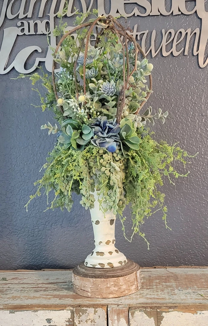 This topper has blue moneywort and hydrangea.Â