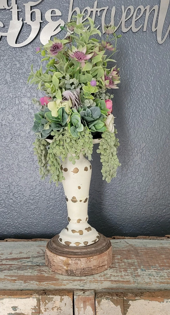 Pink, lavender and cream florals accent this candlestick topper that features frosty greenery and cascading succulents. Dress up your candlestick for spring and summer.Â