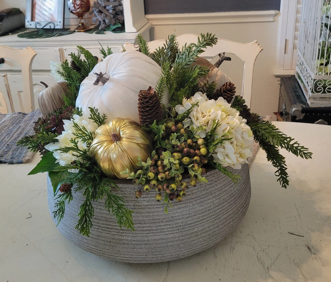 This “Showstopper” fall arrangement is designed with velvet and gold pumpkins and assorted cream flowers.Â