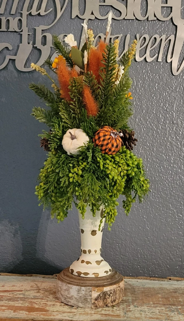 This fall topper is designed with real touch pine and gingham pumpkins.Â