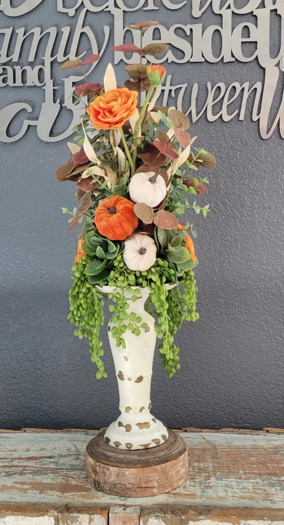 This fall topper is designed with eucalyptus and velvet pumpkins.Â