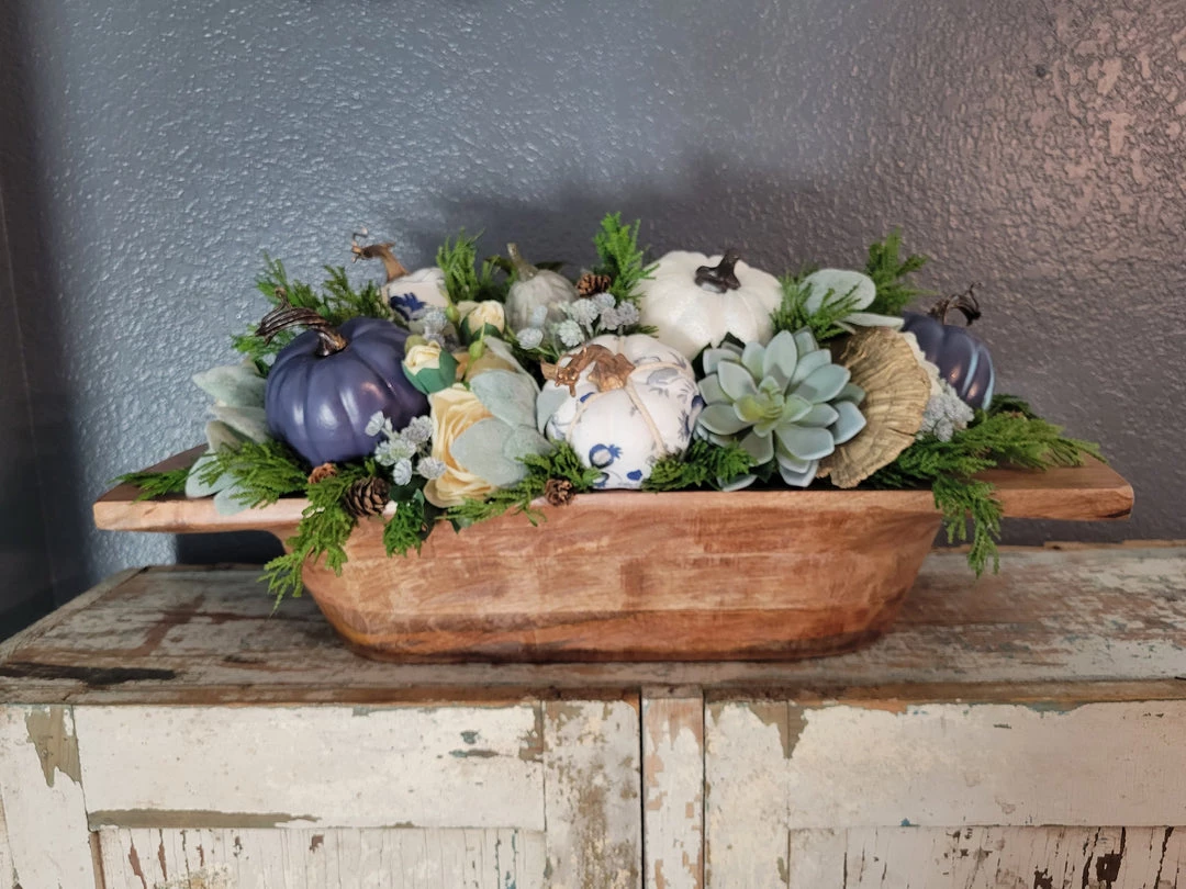 This fall centerpiece is designed with assorted navy and cream pumpkins, real touch hydrangea and succulents.Â