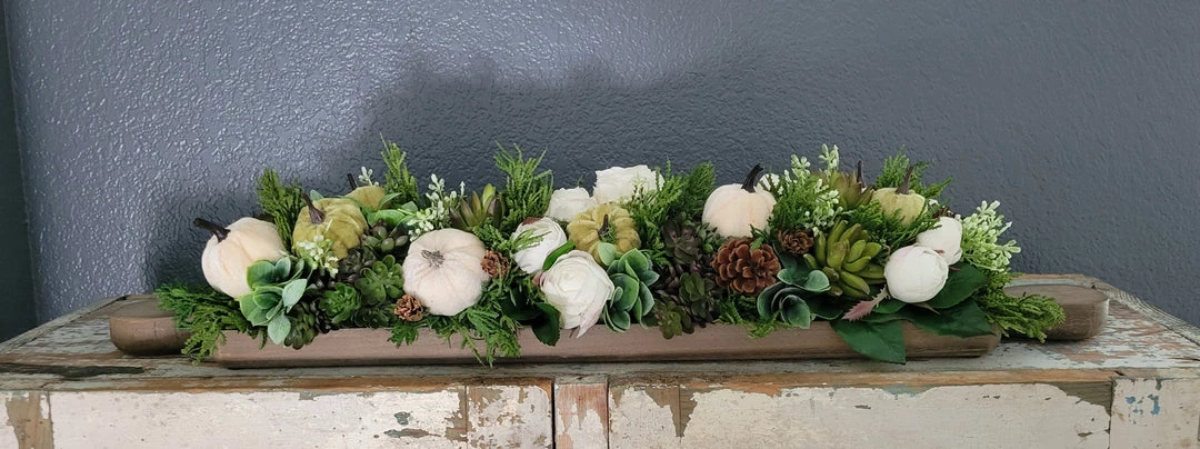 This arrangement on a wood handled bread tray is designed with creams and greens to add a subtle pop of color.Â