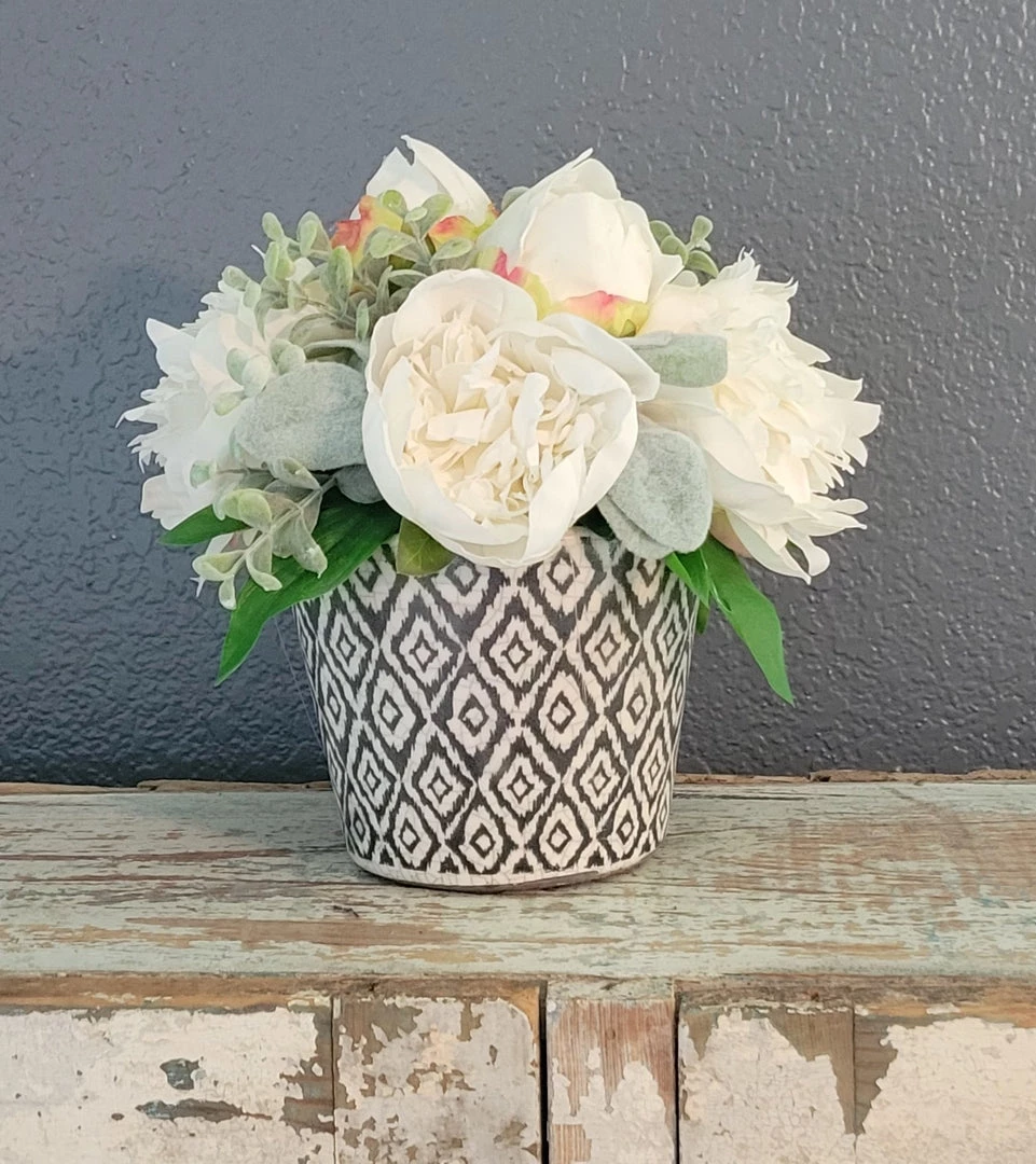 This ceramic black and white container is filled with real touch cream peony and lamb’s ear.Â