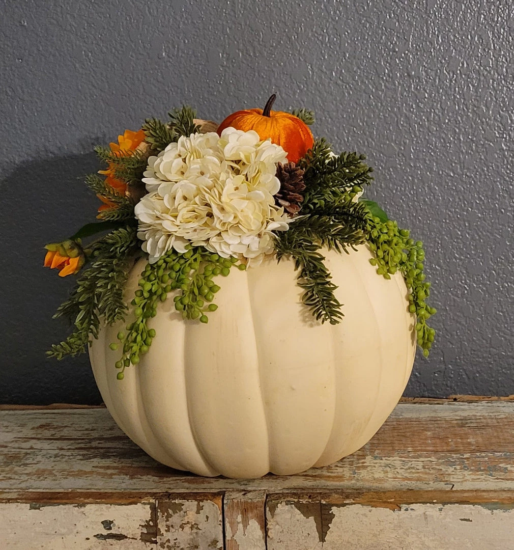 This cream pumpkin is filled with an orange velvet pumpkin and cream hydrangea.Â