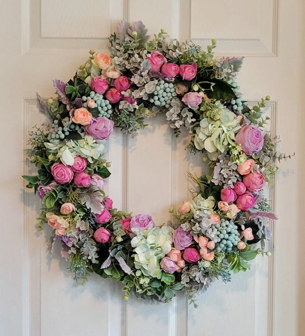 This wreath has teal berries, hydrangea and real touch roses.Â
