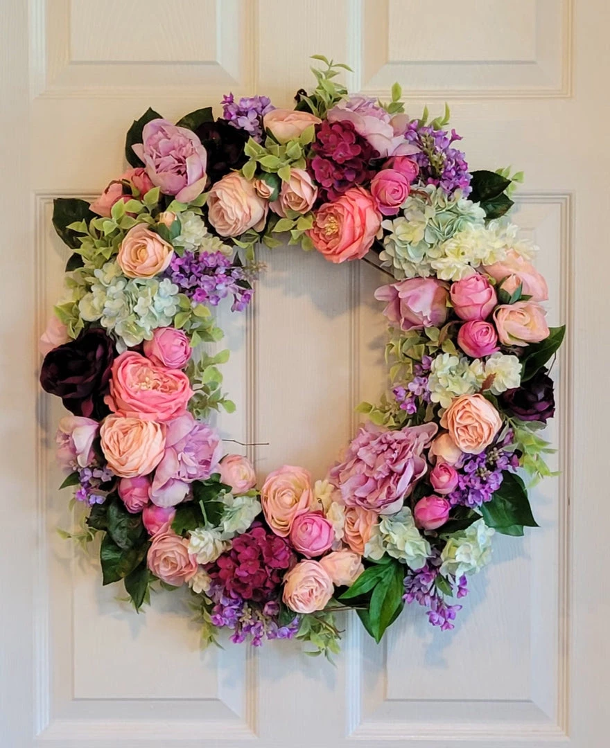 This wreath ia designed with different tones of purples and pinks on an 18″ grapevine base.