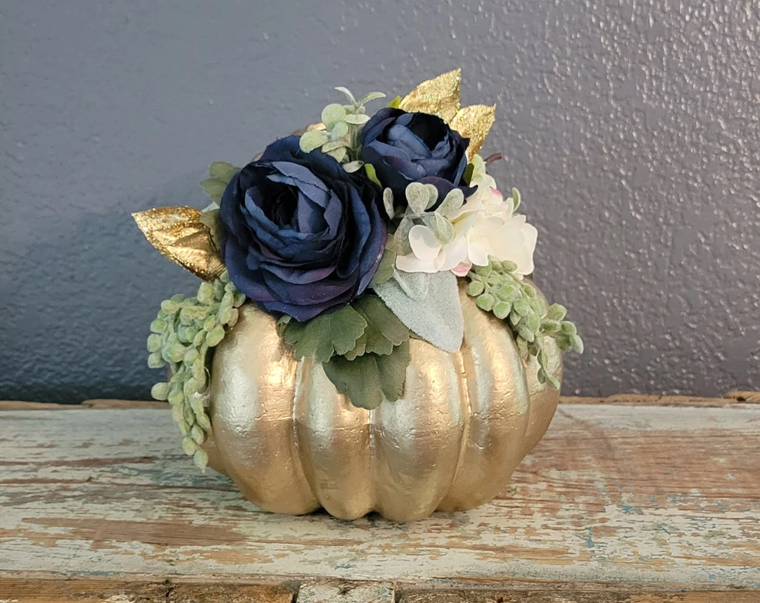 This 7″ gold pumpkin is filled with navy ranunculus.Â