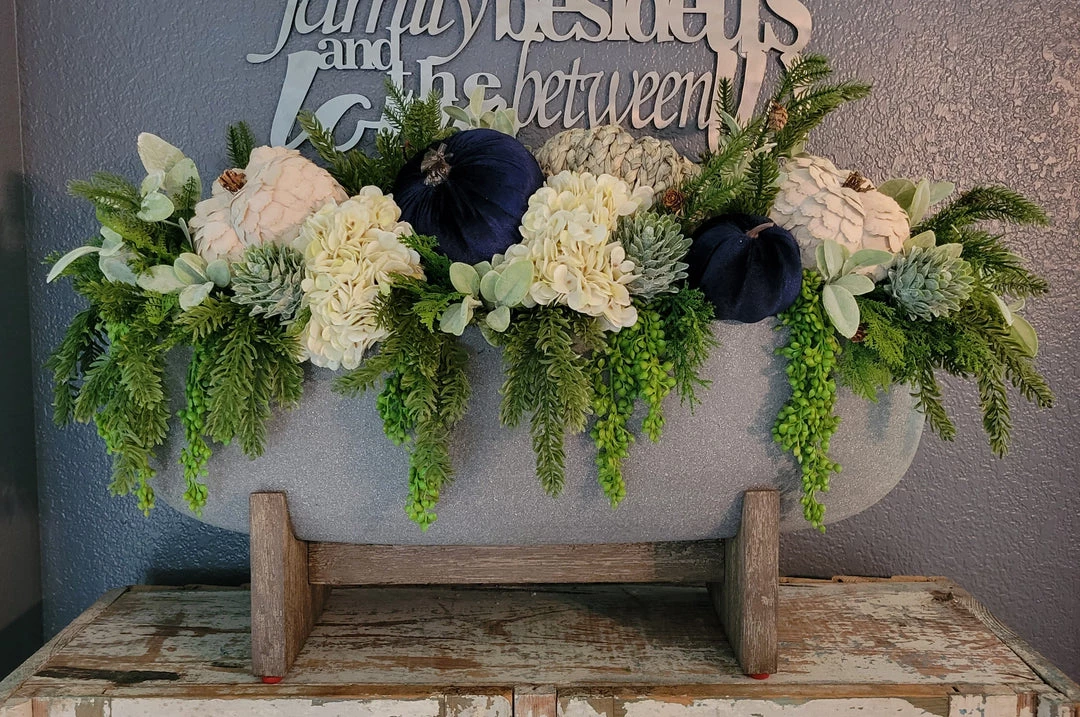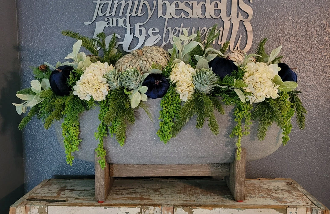 This fall arrangement is designed with assorted real touch pine, navy velvet pumpkins and cream hydrangea.Â