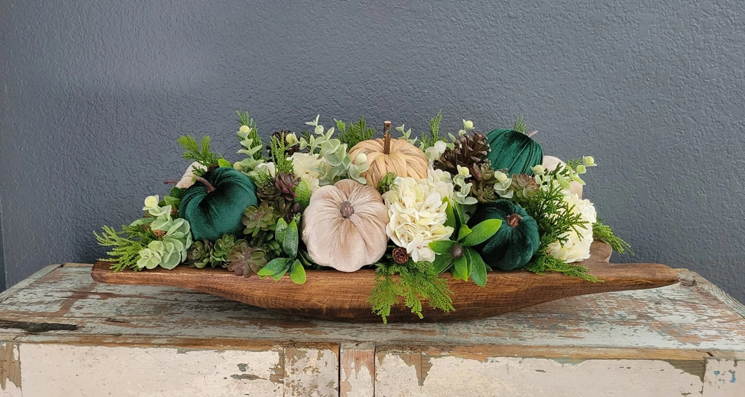 This handled wood doughbowl centerpiece is designed with velvet pumpkins and cream hydrangea.Â