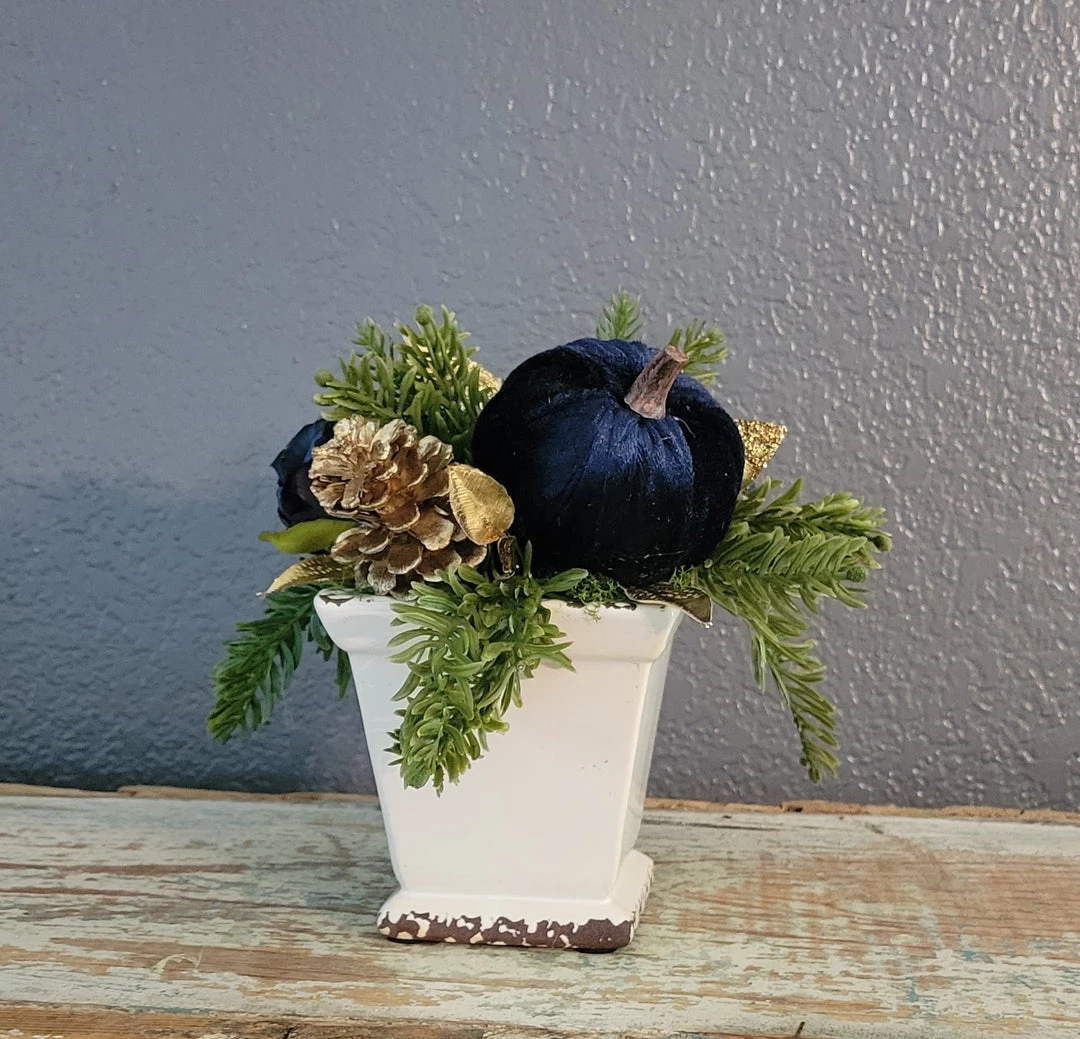 This versatile arrangement is designed with navy velvet pumpkins and gold pinecones.