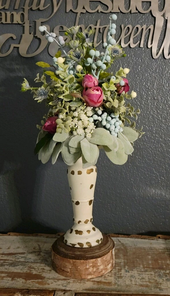 This has 10″ candle topper features fuchsia rose buds, pale blue and white flowers, and teal berries complemented by spilling lamb’s ear, succulents and greenery.
