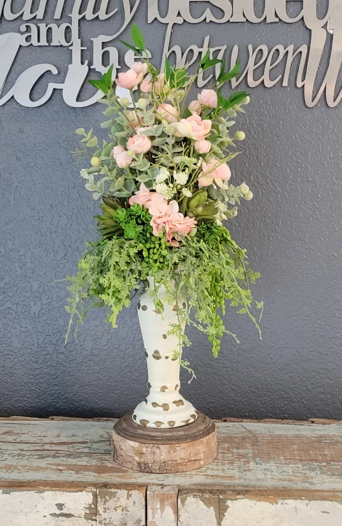 This sweet candlestick topper features a spray of light coral ranunculus and hydrangea above, with greenery and cascading ferns and succulents below.Â