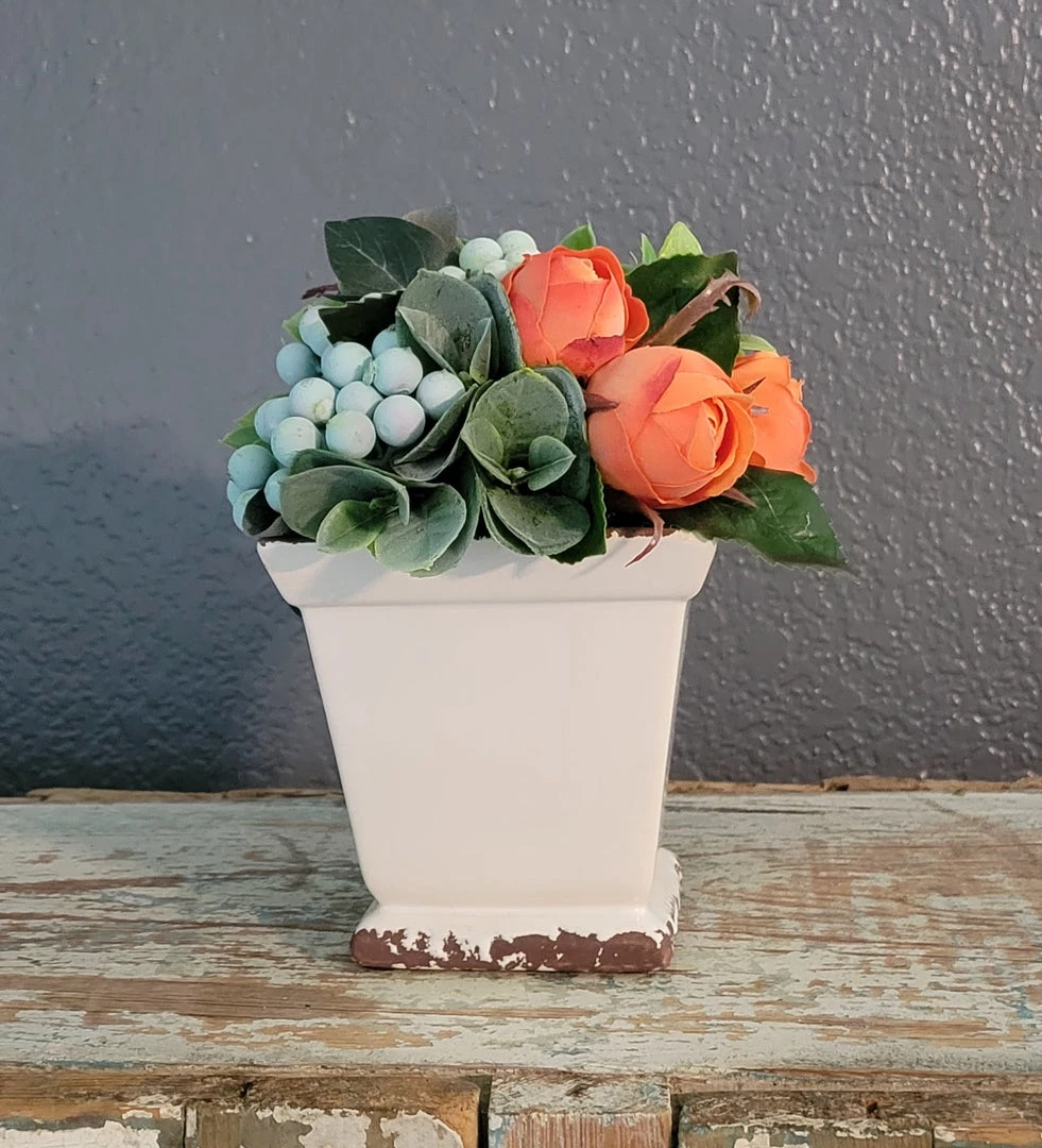 Add a pop of color with this 6″ tall sit around designed with teal berries and orange rose buds.Â