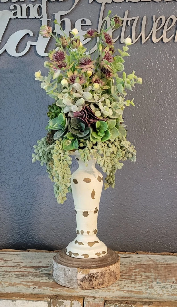 This topper has assorted purple tones with moneywort and hydrangea.Â