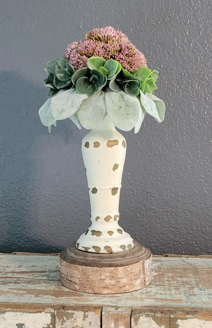 This versatile 5″ wide arrangement is designed with lamb’s ear and greenery.