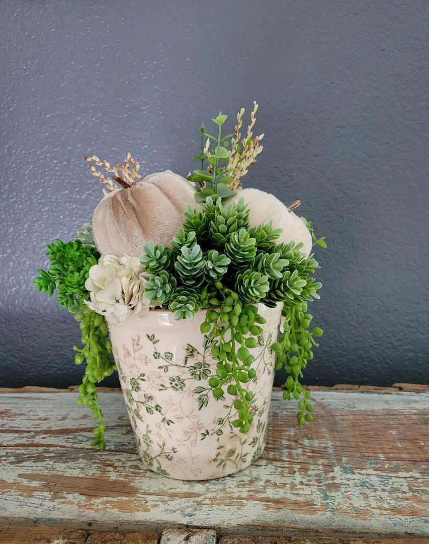 This versatile arrangement is designed with a champagne velvet pumpkin and a cream velvet pumpkin.Â