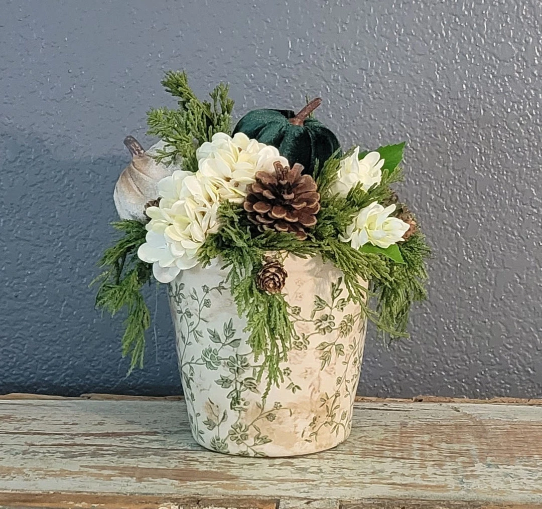 This 11″ tall fall arrangement is designed with velvet pumpkins and cream hydrangea.Â